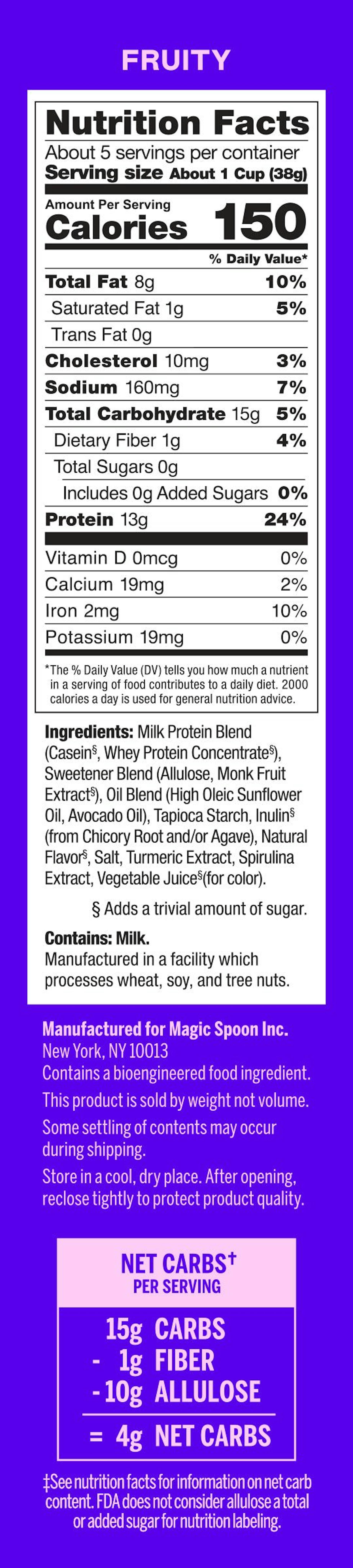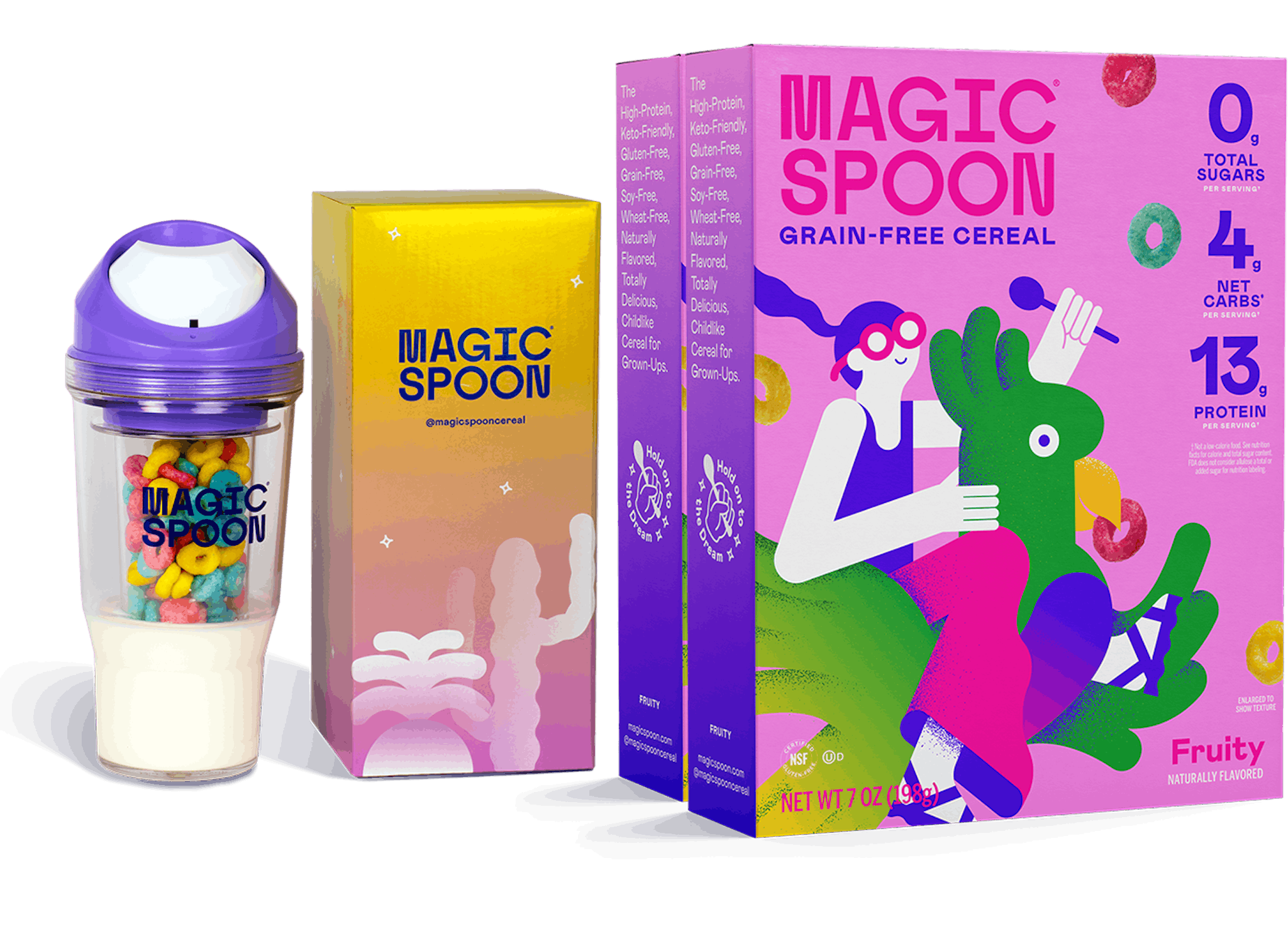 The ultimate Magic Spoon Bundle! Try two boxes of our bestselling flavor Fruity, plus get our one-of-a-kind Crunch Cup for cereal on the go. We’ve reimagined all your favorite childhood cereals with 4g net carbs, 13g complete protein, and no artificial ingredients.