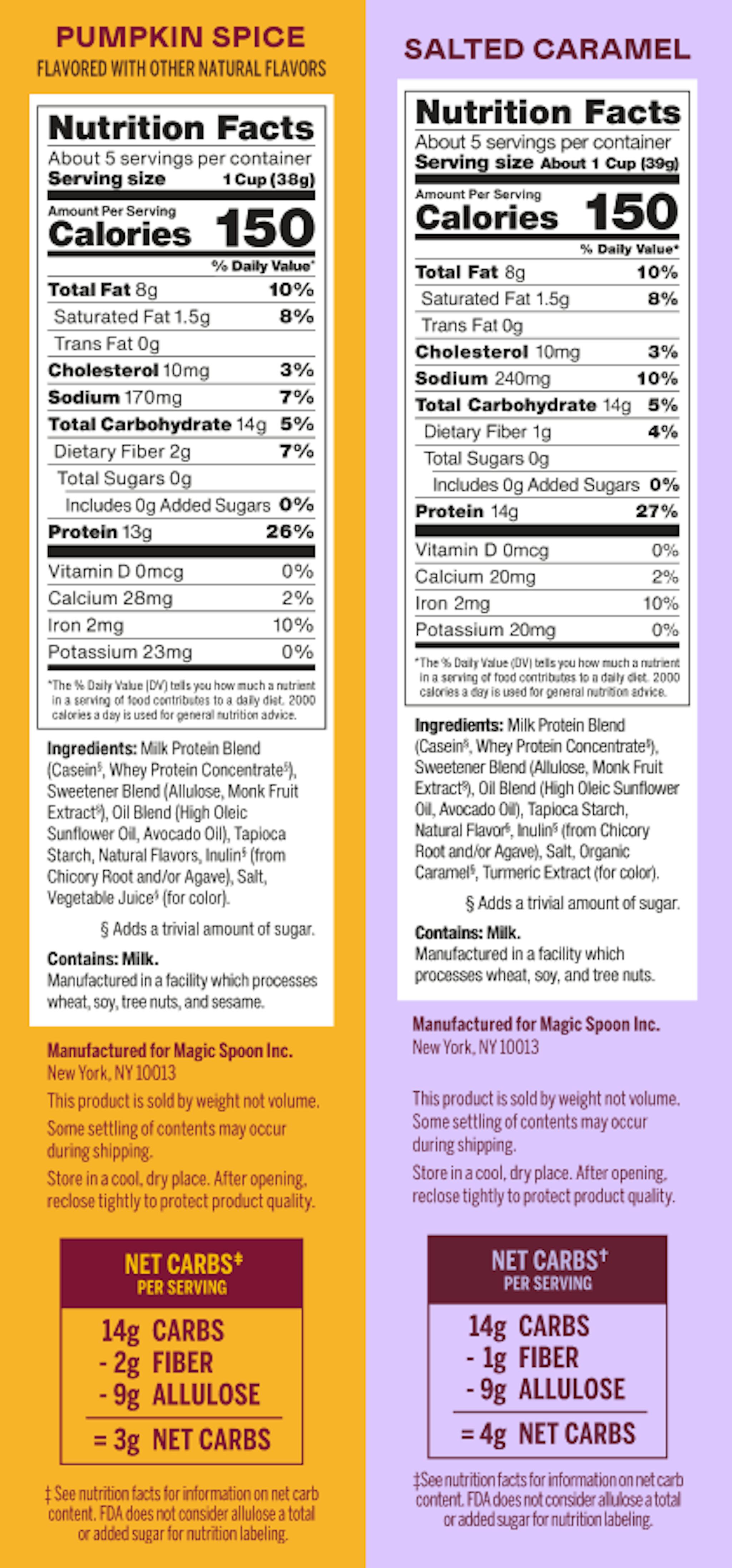 *Serving sizes are as follows: Pumpkin Spice 38g, Salted Caramel 39g. Information as of June 2022.