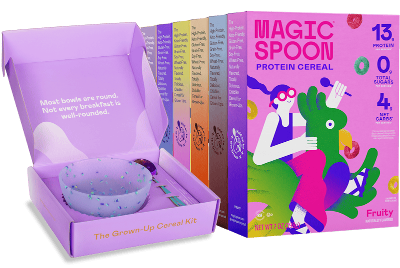 The ultimate Magic Spoon Starter Pack! Try all of our classic flavors—Fruity, Frosted, Cocoa, Peanut Butter, Blueberry Muffin, and Cinnamon Crunch, plus get our one-of-a-kind Zebra bowl and spoon set. We’ve reimagined all your favorite childhood cereals with 4-5g net carbs, 12-14g complete protein, 140 calories, and no artificial ingredients.