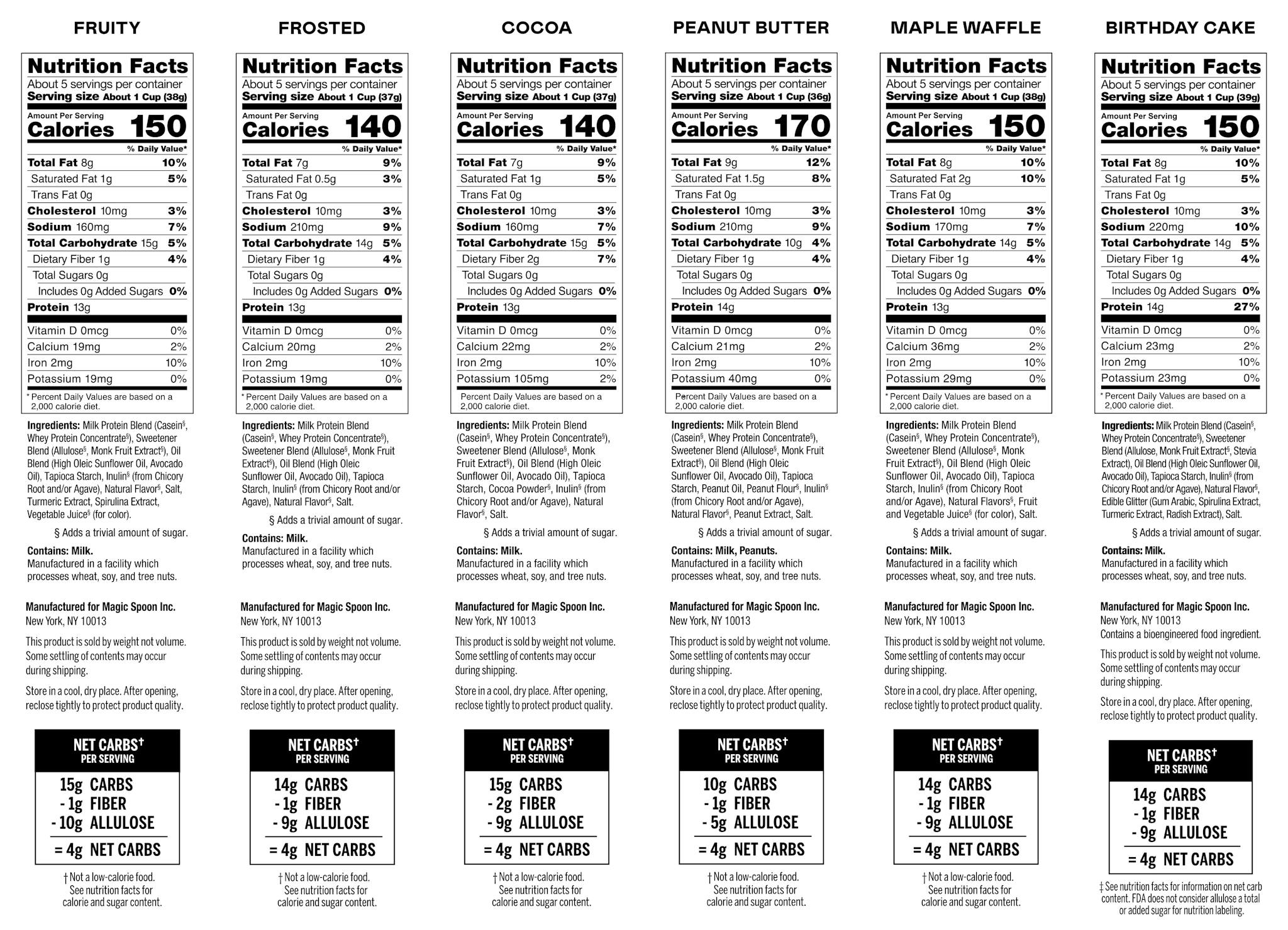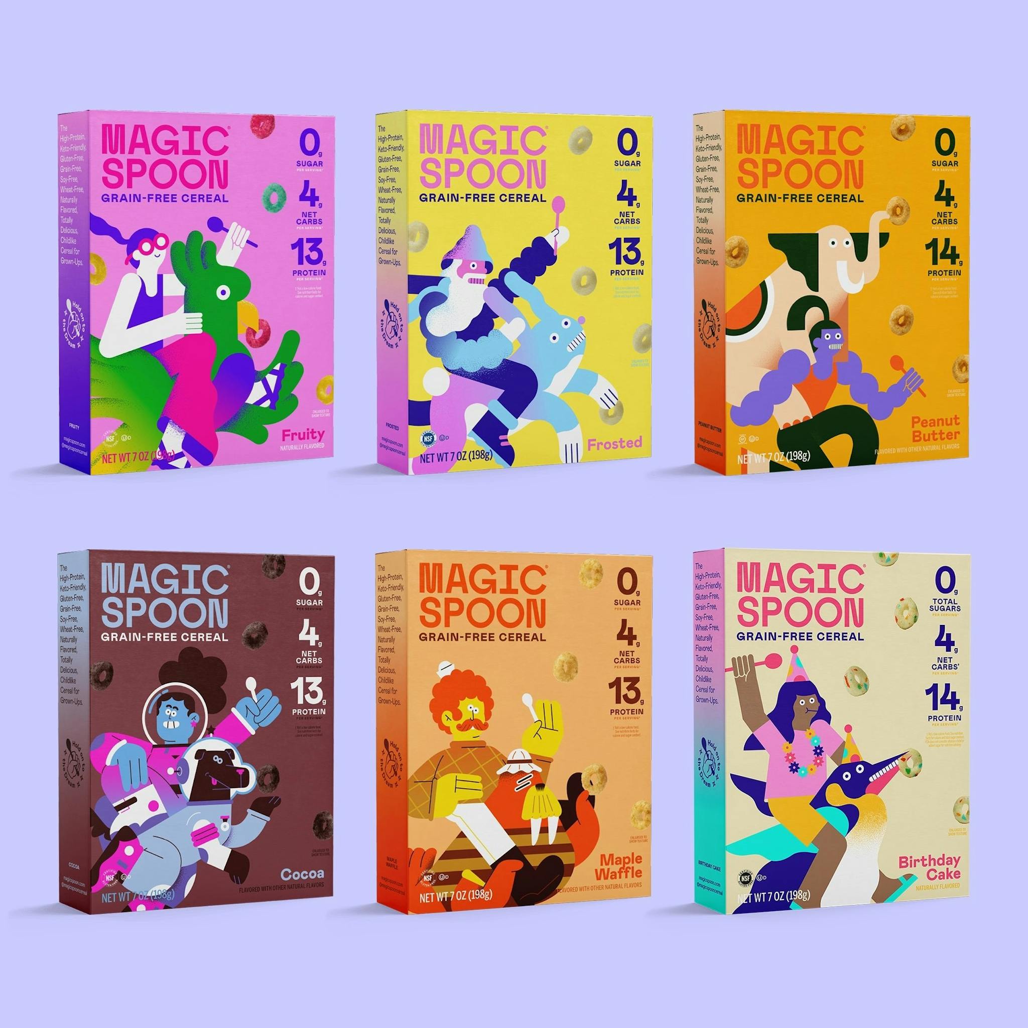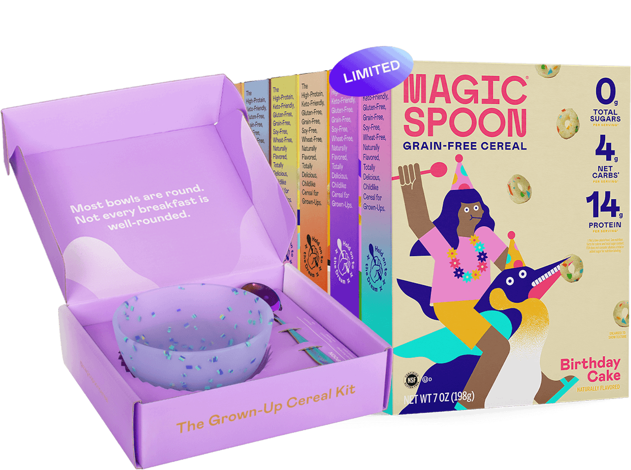 It’s your birthday wish come true! The best of Magic Spoon, plus a special guest. Get our bestsellers Fruity, Cocoa, Frosted, Peanut Butter, and Maple Waffle with limited edition Birthday Cake, plus a special bowl and spoon! We’ve reimagined all your favorite childhood cereals with only 4g net carbs, 12-13g complete protein, and nothing artificial.